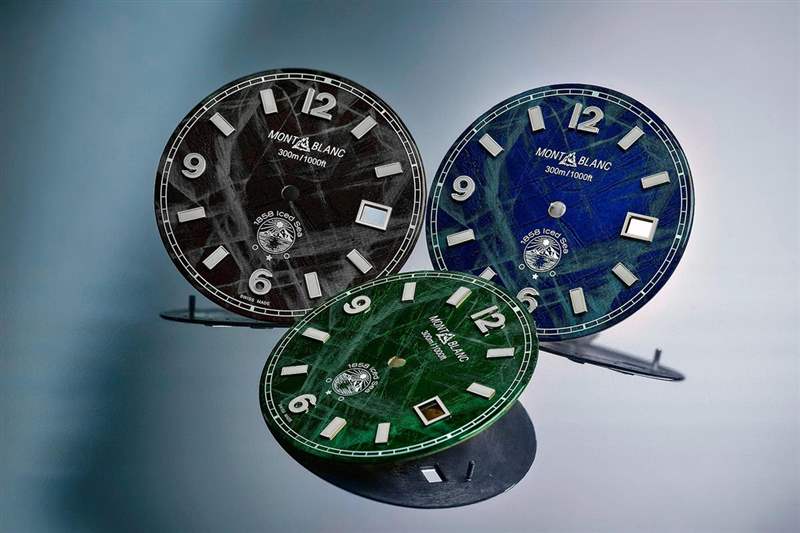 1858 Iced Sea一共有三種面盤顏色:藍、綠、黑,搭配同色的陶瓷材質表圈,最特別的地方是它的面盤,這是萬寶龍以一種獨特的古老刮磨技法(Gratté Boisé),創(chuàng)作出有深度的紋路,猶如冰河上的裂紋,尤其裂紋在光線照射下更顯深邃立體。在此萬寶龍還藏入一個小巧思,之所以選擇藍色、綠色與黑色,分別代表著冰河的不同顏色,像是南極洲則可以看到綠色的冰、極地則有黑色的冰,靈感其來有自。而面盤6點鐘則有一個萬寶龍專為1858 Iced Sea所設計的Logo,后底蓋上同樣用雷射雕刻出相同的圖案,非常細致。