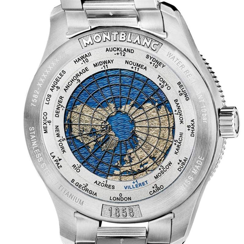 另一個特別的地方是,通常以巴黎為代表的中歐時間,更改為萬寶龍瑞士制表總部Villeret;另一款藍面鋼帶款的表殼底蓋更可客制化,以紅色顯示腕表主人的家鄉(xiāng)與當?shù)貢r區(qū)。