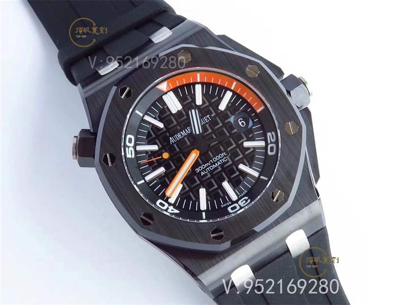 JF愛彼15707整體呈黑色,給人一種很低調時尚的感覺,讓人愛到極致,表頭經典的八角造型,深深的吸引到看到這只表的所有人,藍寶石鏡面下日歷窗的迷你藍寶石鏡面鍍藍膜,讓人有一種莫名的感動,橙色的刻度內圈給人一種與生而來的自信,這只表仿佛一只啞光版的黑色蘭博基尼一樣性感迷人。