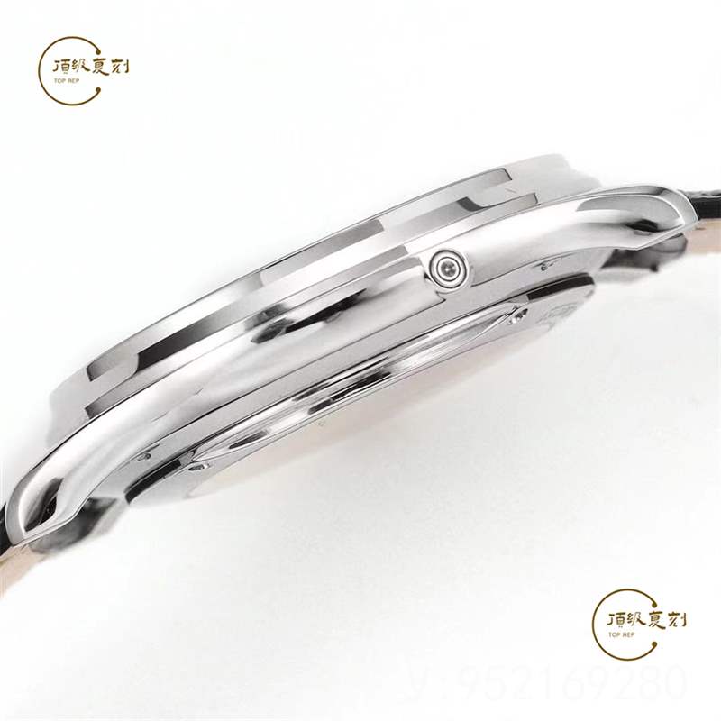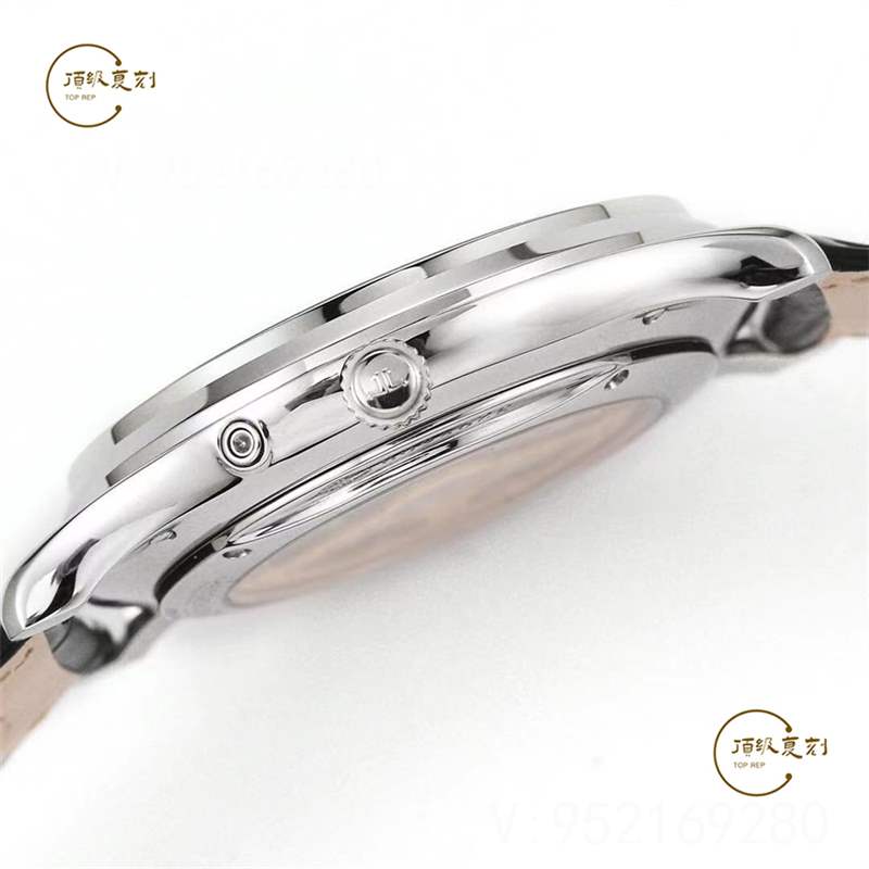 細膩內斂的典雅氣韻GF廠積家月相大師系列「1368430」復刻腕機芯選用Miyota9015改自產Cal.925/1機芯選用德國進口CNC數控機床銑花,銑斑紋細膩清楚,僅有對版縱向日內瓦紋,數控精雕鏤空鏈條盒讓機芯看起來“更積家”。主動陀電鍍了特調的K金色,并非普通的紅玫瑰金,主動陀螺絲也選用圓頭藍鋼螺絲,實實在在匠心打造,讓整個腕表看上去更加的完美。