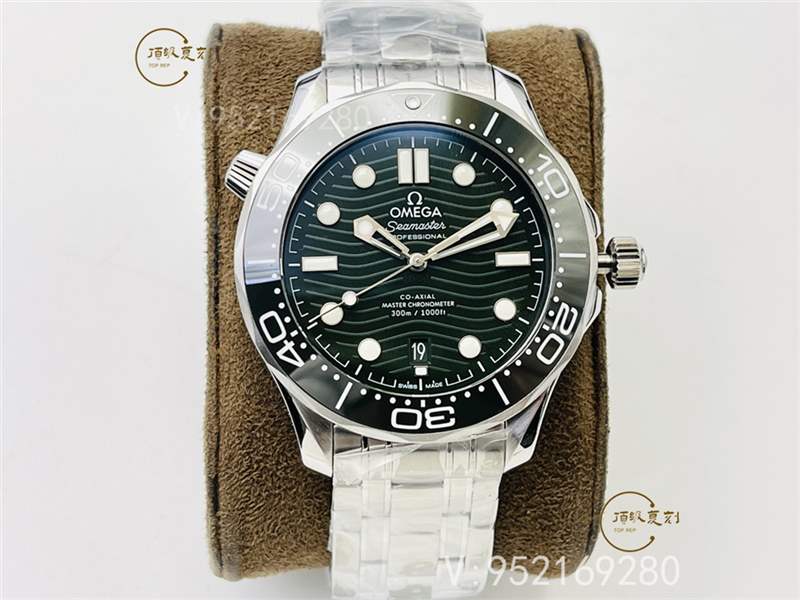 1.今年,歐米茄專柜推出了海馬系列300米新款潛水表,采用綠盤面的設(shè)計(jì)。綠色盤面能帶給人活力感,顯得更加現(xiàn)代、更年輕。VS廠歐米茄海馬300綠盤采用的綠色更偏向卡其綠。低調(diào)的風(fēng)格。VS出品鋼帶有贈送多一副綠色膠帶。