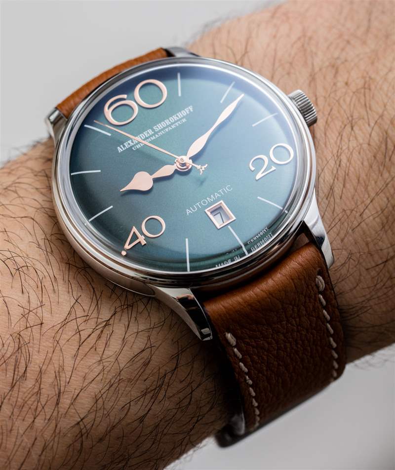 Alexander Shorokhoff 為 Model 63 提供四種表盤顏色,包括圖中的“翡翠綠”、“午夜藍、深黑”和“波爾多”。據我估計,這些顏色中的每一種在搭配盡可能接近表盤顏色的表帶時都會看起來最好,盡管添加黑色或棕色表帶顯然是最保守的選擇。再說一次,我不確定 Alexander Shorokhoff 作為一個品牌是否適合保守的鐘表佩戴者。