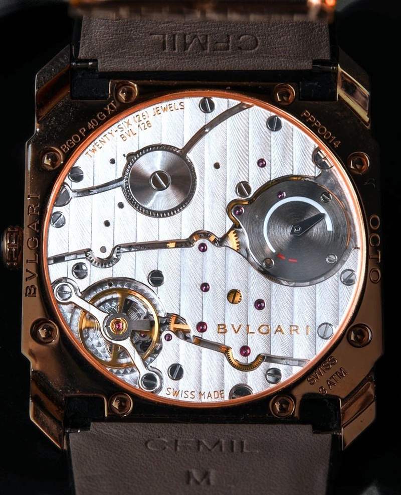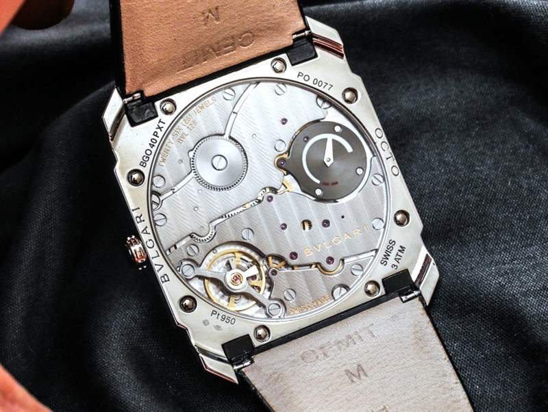 BVL 128 機芯以現代 4 赫茲頻率運行,并具有 70 小時的長動力儲存(對于如此薄的機芯)。機芯通過偏心小秒盤指示小時和分鐘。奇妙的是,寶格麗決定在機芯后部加入一個動力儲存指示器——這一功能對我來說真的提升了“想要”的水平,因為我覺得動力儲存指示器幾乎是必須的(主觀選擇)手動上弦手表。否則,我只是一直強迫性地給手表上弦。