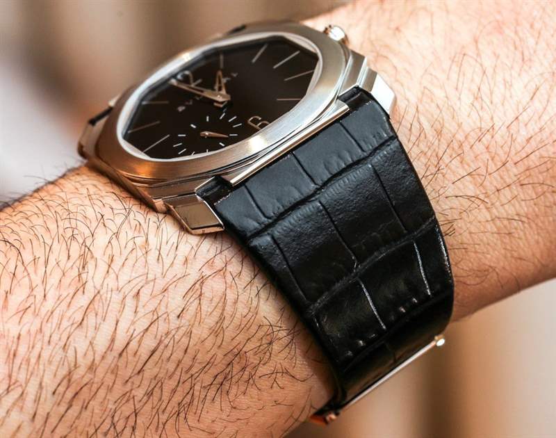 附在 Bulgari Octo Finissimo 表殼上的是一條錐形鱷魚皮表帶,由于其“卷邊”結構(我幾乎普遍喜歡正裝手表上的鱷魚皮或鱷魚皮表帶),因此無縫縫合。
