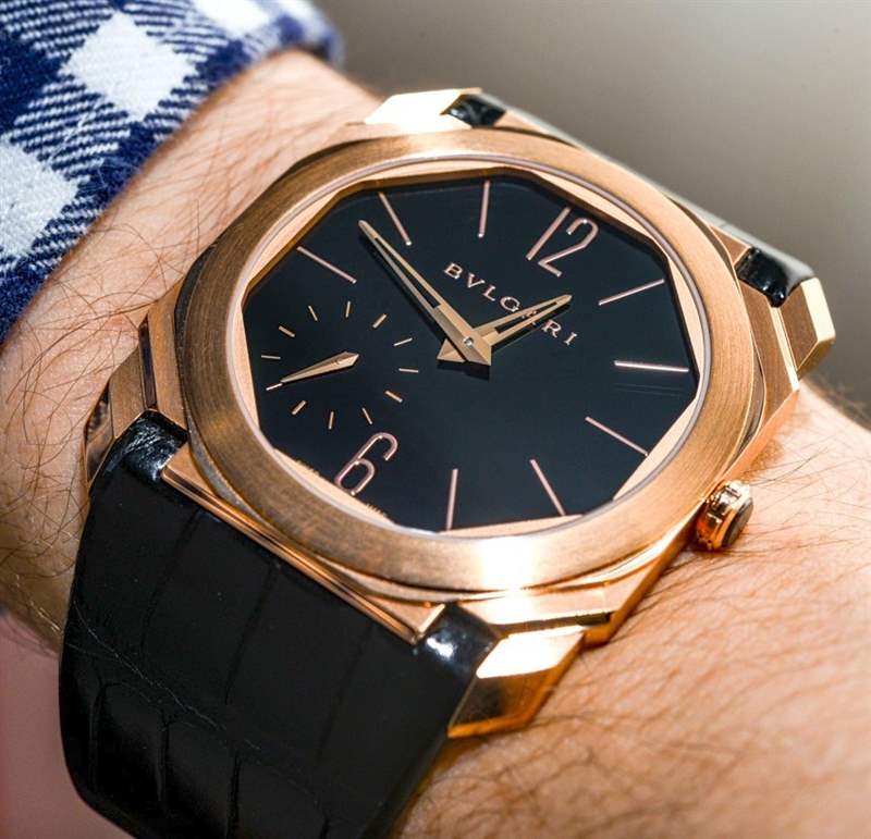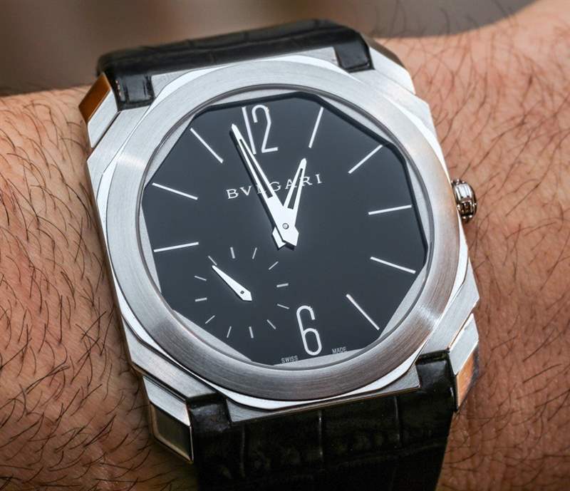 寶格麗 (Bulgari) 改進了表盤的易讀性,最初采用超亮黑漆表盤和拋光立體時標和指針。事實上,金色的表盤看起來特別漂亮——但話說回來,Octo 風格的表殼在鋼/白金/鉑金色調中看起來確實非常漂亮。您可能想知道 Octo 表殼(通常較厚)是什么樣子……好吧,“扁平”。我有點擔心這一點,但在大多數方面,標準 Octo 的表殼幾乎完全相同——只是薄了幾毫米。保留了有吸引力的對比拋光,主要是拉絲表面,但也有一些從側面最容易注意到的漂亮拋光表面。鑲嵌在表冠上的是黑色凸圓形陶瓷。廣告留言廣告信息結束