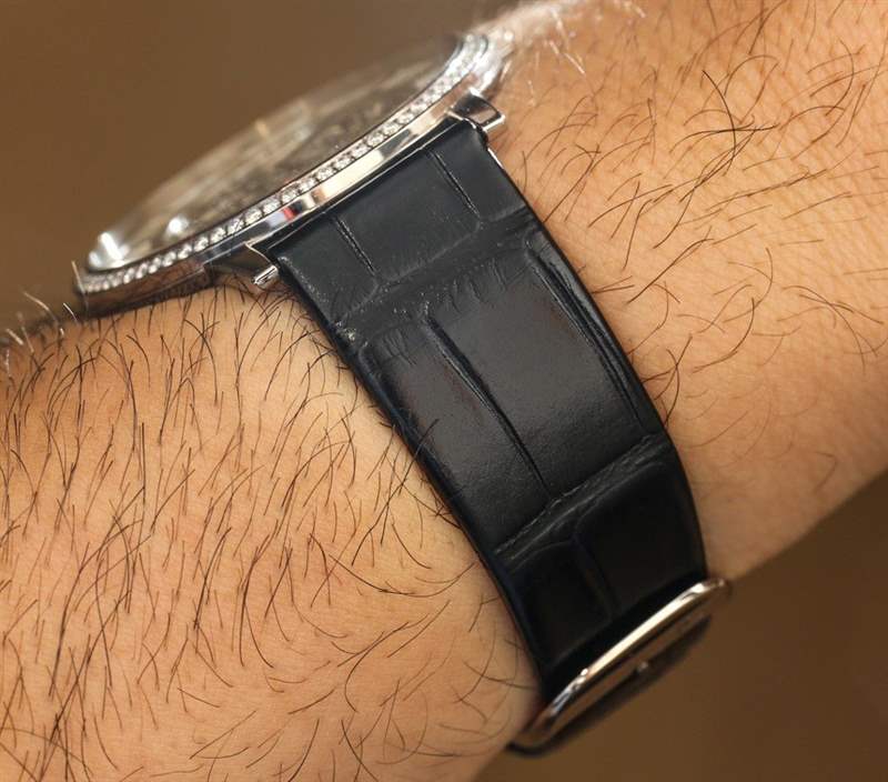 盡管如此,將這款“更胖”的積家Master Ultra Thin Squelette鑲鉆版腕表戴在手腕上,你仍然有種戴上晶圓的感覺。表殼由 18k 白金或玫瑰金制成,看起來幾乎不比迷人的卷邊鱷魚皮表帶厚。作為記錄,這些類型的正裝手表表帶是我最喜歡的。在我看來,可見的縫線被高估了……39 毫米寬的 Jaeger-LeCoultre Master Ultra Thin Squelette 并不是一款大膽的手表,但它在大多數男士手腕上看起來不錯的正裝手表范圍內。