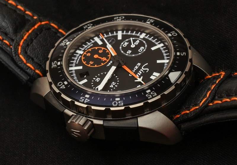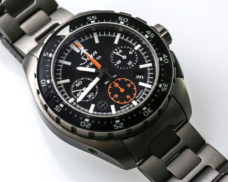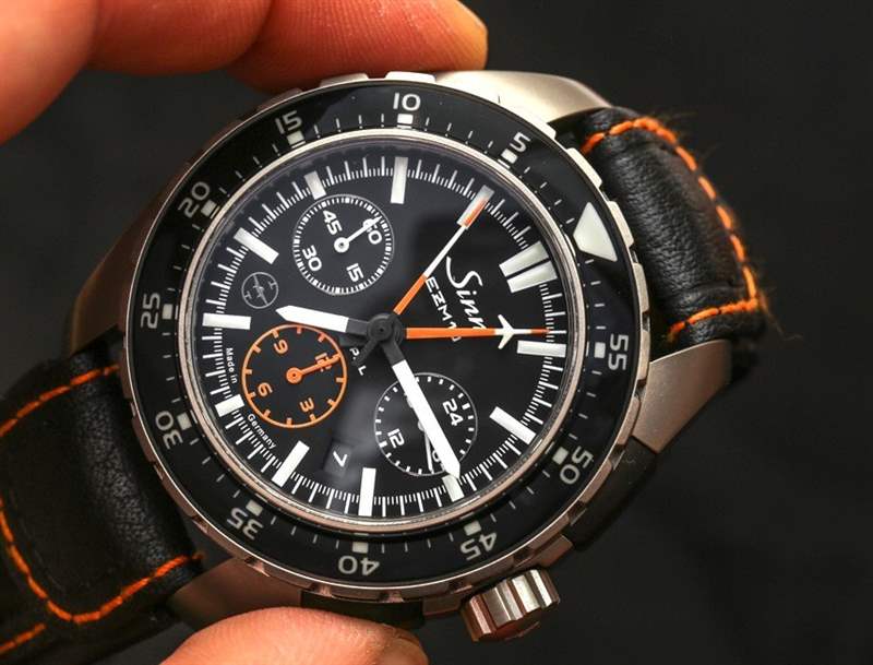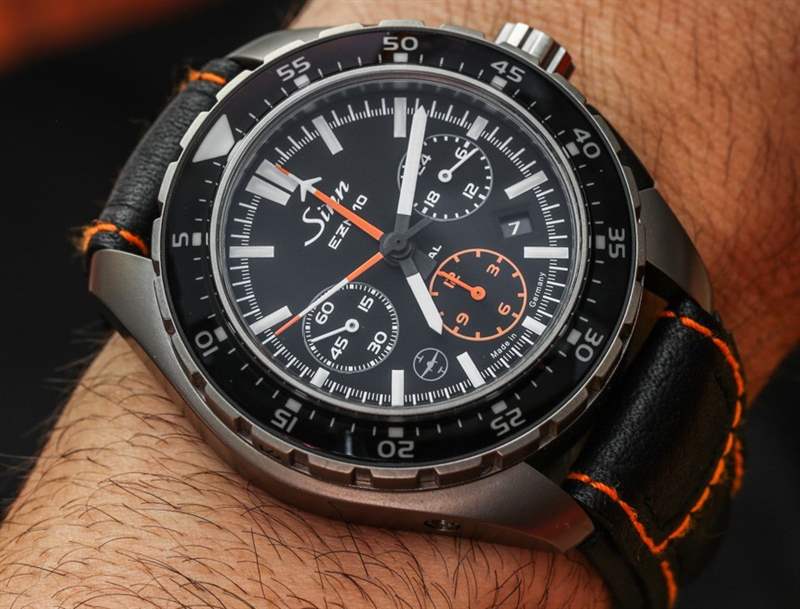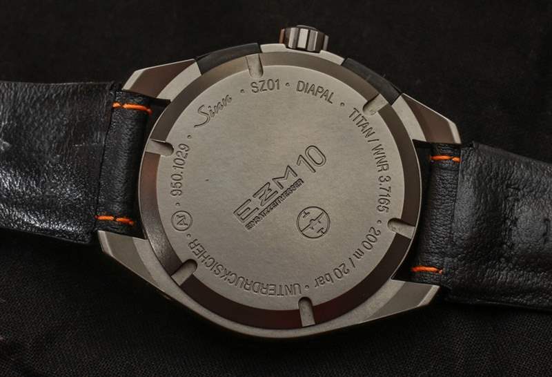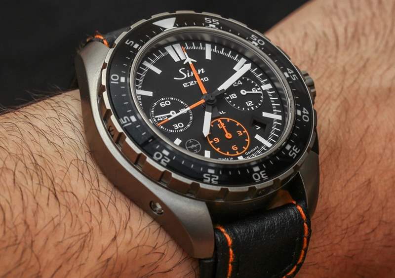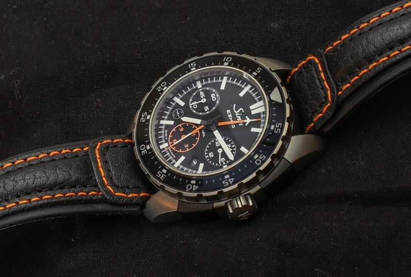 EZM 10 如此成功的部分原因是完全沒有額外的元素,沒有反光表面,以及選擇合適的材料進行對比和強調的近乎完美的感覺。Sinn 使用橙色作為計時指針和計時小時子表盤等其他元素,但除此之外一切都是簡單的單色。戴上鈦金屬表鏈,更像是一只“工具表”。帶襯墊的厚皮表帶舒適且質量上乘,但您并不總是想佩戴鮮艷的橙色表帶。這就是為什么我強烈建議您也選擇鈦手鐲,這是一個額外的購買選項。
