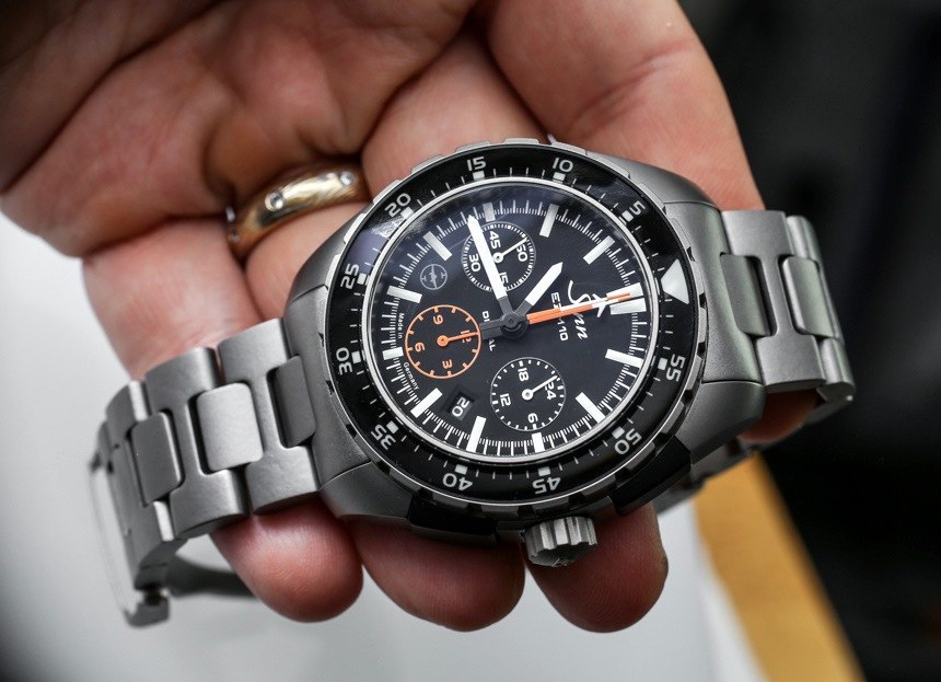 由于減輕了重量,鈦金屬確實幫助這款相當大的手表佩戴起來非常舒適。Tegimented 鈦手鐲非常輕,雖然表殼不是很輕,但如果是鋼制的話會重很多。44 毫米寬的 EZM 10 具有寬表耳和厚 15.6 毫米的外殼,充分利用了該尺寸(“佩戴大”),因此相對較輕的 95 克(就是這種情況)非常耐磨。是的,EZM 10 對于某些手腕來說可能有點小,但我的中小手腕可以很好地容納它。
