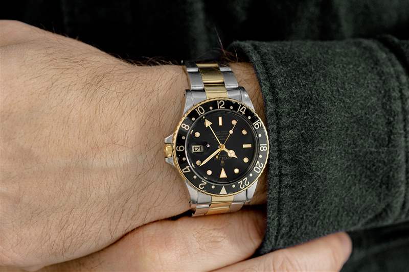 一個(gè)星期五,下午6點(diǎn)15分,寫這篇文章的時(shí)候,我的內(nèi)心有些糾結(jié):我喜歡這只表嗎?我又回到了我的雙色手表難題:它不完全是金,也不完全是鋼,感覺它試圖成為一切,但又不完全。在我看來,尤其是雙音 GMT,因?yàn)槎嗄陙砦乙恢痹趯?dǎo)師的手腕上看到它;本能地,它最好屬于一位紳士的手腕,他贏得了自信,可以毫不費(fèi)力地穿上一件帶有金色紐扣的雙排扣海軍藍(lán)色夾克。不知怎的,我覺得我還沒有資格戴這塊表。但是在看了這個(gè)例子并長時(shí)間停頓之后(是的,我有想得太多的傾向),我決定是時(shí)候回過頭來擁抱這個(gè)半金半鋼的創(chuàng)作了。我喜歡表盤上有簽名“1986 年勞力士 GMT-Master Ref.?蒂芙尼 (Tiffany & Co) 零售的 16753 雙色調(diào)