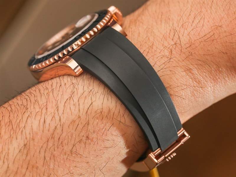 Oysterflex 非常酷,實際上,我確實希望勞力士將這種新的表帶選項推廣到其他手表。我們可能會在未來看到這一點,但勞力士并沒有多說。Oysterflex 并非由天然橡膠制成,盡管它的觸感幾乎與天然橡膠一模一樣。手鏈的結構以金屬“刀片”(鈦鎳合金)開始,形成基本形狀并使其牢固貼合。表帶上最有趣的元素之一是下方的“鰭狀物”,旨在在表帶和手腕之間形成緩沖。這允許您的手腕稍微伸展和收縮,同時表帶保持舒適和貼身,并且還有助于在炎熱的天氣里讓表帶的內部稍微通風。這是一款由“彈性體”材料制成的手感極佳的表帶,連接到 18k 玫瑰金展開式表扣。
