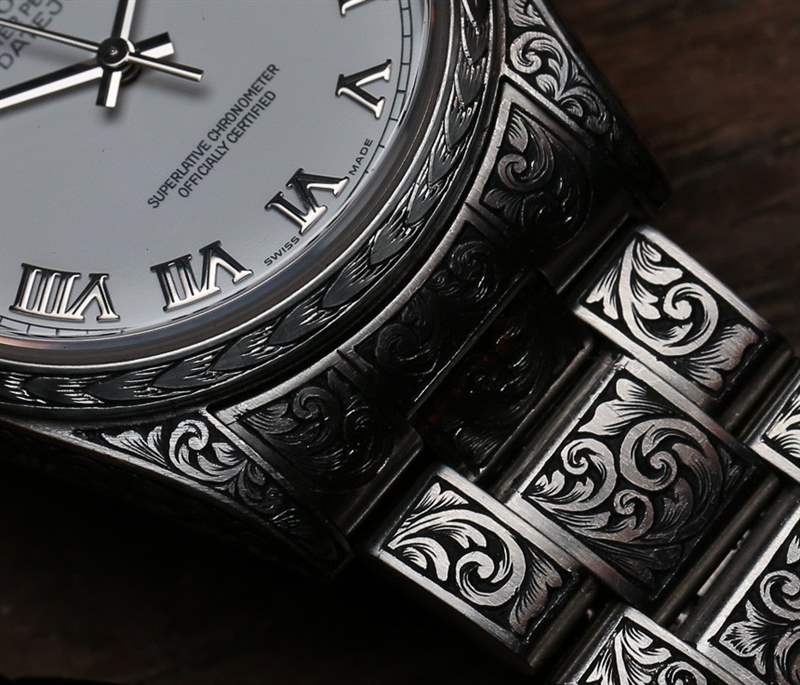 說到手工勞動,我不得不問 Halvorson,雕刻師在裝飾這些勞力士手表的表殼和表鏈時是否遇到了問題。現代勞力士時計使用一種非常堅硬的鋼材,即 904L 合金。除了非常耐腐蝕之外,904L 鋼還很難加工。雕刻師通常喜歡使用較軟的金屬,如金、銀或黃銅。雖然我沒有機會與雕刻師討論,但 Blaine 確實回應說,雕刻師對每只手表雕刻的難度提出了很多抱怨。