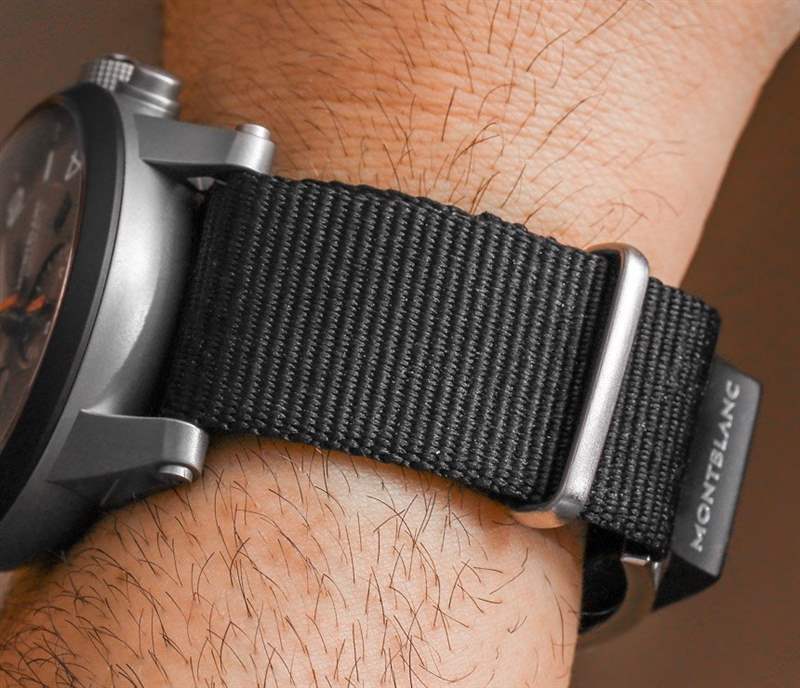 盡管萬寶龍打算讓萬寶龍 e-Strap 適合各種表帶(最終),但他們創(chuàng)造了一種特殊的北約風(fēng)格皮革表帶,以配合 Timewalker Urban Speed 手表系列的發(fā)布。請注意,它并不是 Timewalker Urban Speed 手表可用的唯一表帶選項(xiàng)。用于固定萬寶龍電子表帶的表帶采用具有科技感的碳纖維圖案皮革制成,非常薄,側(cè)面有一個(gè)帶扣。總而言之,我認(rèn)為表帶和萬寶龍電子表帶的組合效果很好。