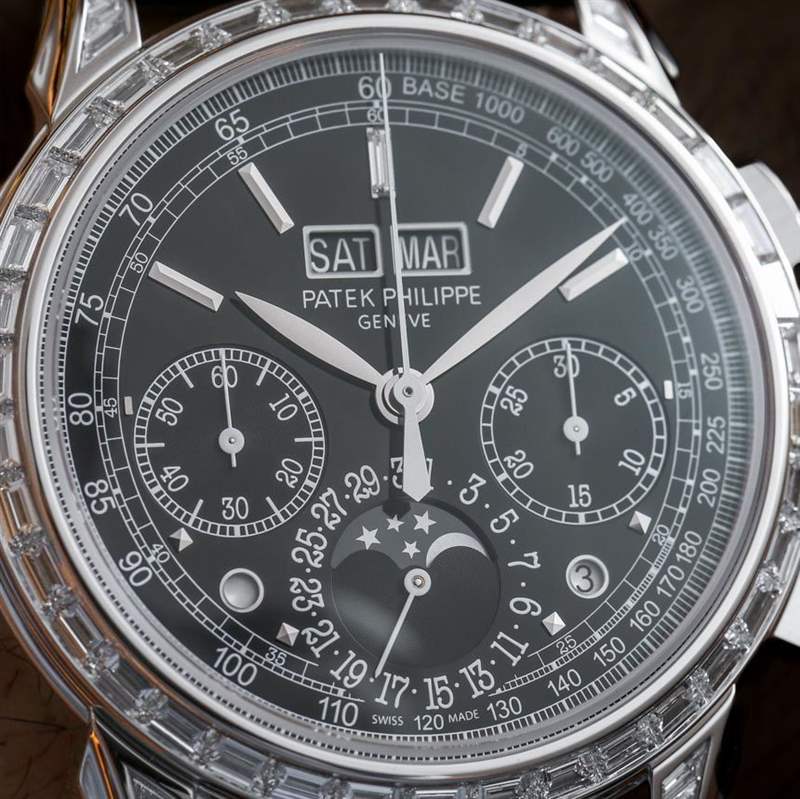 兩款 2014 年百達翡麗 5270G 型號采用 18k 白金材質,而 5271P 則采用鉑金材質。白色表盤的是百達翡麗5270G-013,藍色表盤的是5270G-014。百達翡麗 5270 的其他黃金版本尚未發布。我不太清楚為什么 5271 有不同的名字,但我只能假設是因為它帶有很多鉆石裝飾。雖然機械表純粹主義者通常對鉆石興趣不大,但百達翡麗在許多客戶對其鐘表的鉆石裝飾感興趣的國家/地區擁有強大的影響力。因此,百達翡麗 5271P-001 的鉑金表殼以及表圈和表耳上的 58 顆長方形切割鉆石(約 3.63 克拉)使其對某些客戶特別有吸引力。
