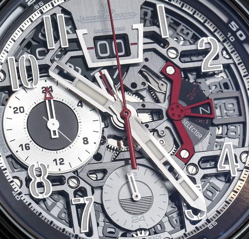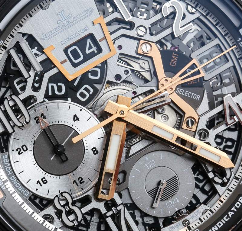 那么那塊積家至尊實驗室2到底有什么功能呢?很難看到的一件很酷的事情是,您可以在計時碼表運行時調整時間——這非常酷。計時復雜功能使用精美的垂直離合器和導柱輪,并通過大日期式數字計數器指示經過的分鐘數。這太酷了,它讓計時碼表的使用變得非常有趣,視覺上也令人印象深刻。Jaeger-LeCoultre 積家設計的 Jaeger-LeCoultre Extreme Lab 2 計時碼表最多可計時 24 小時,而大多數完整計時碼表更常見的是 12 小時。靠近 9 點鐘位置的計時小時計數器中的圓盤用作時間的秒針指示器。