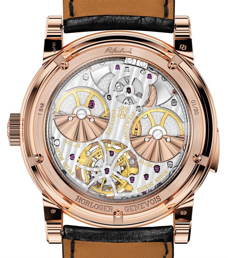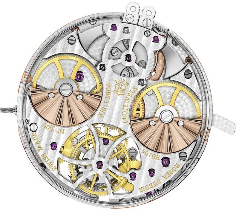 許多手工裝飾是新自制機(jī)芯 RD104 獲得日內(nèi)瓦印記 (Poincon de Geneve) 資格的一部分。幾年前,日內(nèi)瓦印記背后的人大大提高了對帶有印記的機(jī)芯的要求。機(jī)芯除了需要在日內(nèi)瓦州生產(chǎn)并具有一定的性能指標(biāo)外,還需要大量的手工修飾。這意味著大部分單獨(dú)的機(jī)芯部件必須手工拋光。RD104 機(jī)芯包含 434 個(gè)零件,這有助于解釋為什么要花費(fèi)如此多的時(shí)間獨(dú)自進(jìn)行精加工。該機(jī)芯還以 3Hz 運(yùn)行,并具有 60 小時(shí)的動力儲存。微型轉(zhuǎn)子是玫瑰金色調(diào),但實(shí)際上是由鉑金制成的。