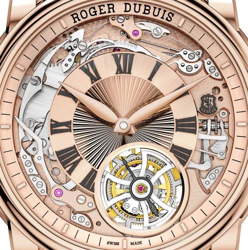 關(guān)于 Roger Dubuis Hommage Minute Repeater Tourbillon Automatic,我最喜歡的部分是表盤。機(jī)芯很漂亮,它提供的鏤空效果恰到好處,可以欣賞到機(jī)械裝置,但又不會多到你無法真正看清表盤的程度。這是一個(gè)非常好的組合,既確保了時(shí)計(jì)清晰易讀,又讓像我這樣的機(jī)械書呆子能夠看到裝飾精美的機(jī)芯。羅杰杜彼 (Roger Dubuis) 甚至提供了一個(gè)關(guān)于機(jī)芯的罕見事實(shí),據(jù)他們稱,制造機(jī)芯所需的 1,241 小時(shí)中有 328 小時(shí)用于手工打磨和拋光。
