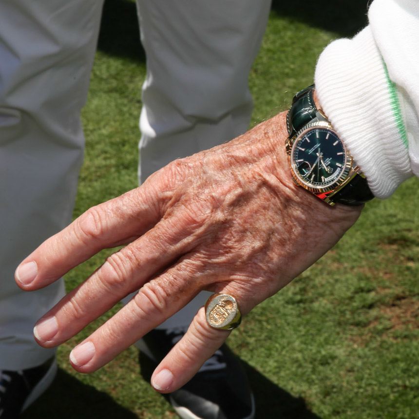 當你看到 Jackie 欣賞自己手腕上的手表時,你可以看出手表人的跡象。在考慮設計的格式塔時,有一種敏銳的目光會吸收所有細節。他的手贊賞地撫摸著水晶玻璃、表圈和手鏈。這是 Jackie 佩戴過無數次的手表,至今仍給他留下深刻印象。此刻,他佩戴的是 18k 金 GMT-Master II,但在過去的幾天里,我看到他佩戴的是 Everose Cosmograph Daytona,還有搭配綠色表帶的全新綠色表盤金質 Day-Date。綠色是他的顏色,英國賽車的顏色,它恰好也是勞力士的顏色。