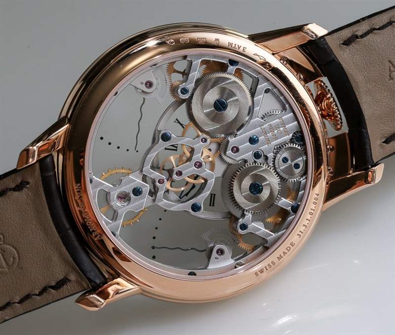 話雖如此,閱讀時間比人們想象的要愉快得多。時間表盤以一圈分鐘指示器和放置在藍寶石水晶上的羅馬數(shù)字時標內(nèi)圈開始。藍鋼指針相對易于閱讀,就其本身(將美學(xué)元素與極簡主義相結(jié)合)而言,表盤工作得很好。在它的正上方和表盤下方的一層是一個輔助秒盤。這個元素有點難讀,但是看的少。