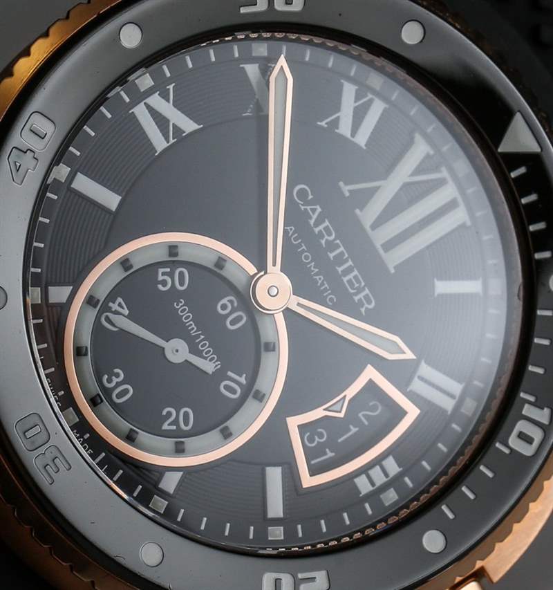 當卡地亞 (Cartier) 正式推出卡地亞 Calibre Diver (卡地亞 Calibre Diver) 腕表時,aBlogtoWatch 于 2014 年初在這里進行了親身體驗。在那里您可以看到精鋼版本和 18k 玫瑰金版本的實際操作圖像。明明是運動手表,我們?yōu)槭裁匆獙彶辄S金版?嗯,首先,我覺得黑色表盤搭配玫瑰金表殼很醒目,其次,我覺得既然是一款奢華的生活方式運動表,為什么不把奢華的元素發(fā)揮到淋漓盡致呢。