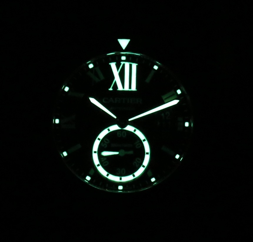 在表盤上,您會看到與標準卡地亞機芯相比有一些變化。乍一看,它們看起來一樣,但并排看時,您會看到重新設(shè)計的分鐘軌道、輔助秒盤和增加的夜光量。這并不是說一個比另一個更有吸引力,但重要的是要意識到差異。每個都非常清晰,并提供半個羅馬數(shù)字和半個指揮棒時標風(fēng)格的表盤。