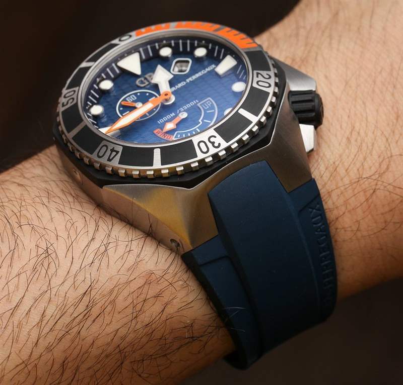Girard-Perregaux Sea Hawk 表殼采用鋼材制成,尺寸為 44 毫米寬,但考慮到寬大的表耳和 17.1 毫米的表殼厚度,它確實磨損很大。表殼防水深度達 1000 米,帶有排氦閥,手表內(nèi)部是芝柏表自制的 GP03300-0074 自動機芯。它上面有一個模塊,提供額外的功能,如動力儲存指示器、日期和輔助秒盤。雖然不對稱,但表盤仍然很平衡。我也很喜歡帶有動力儲存指示器的潛水表。順便說一句,它具有 46 小時的動力儲存,并以 4 赫茲的頻率運行。
