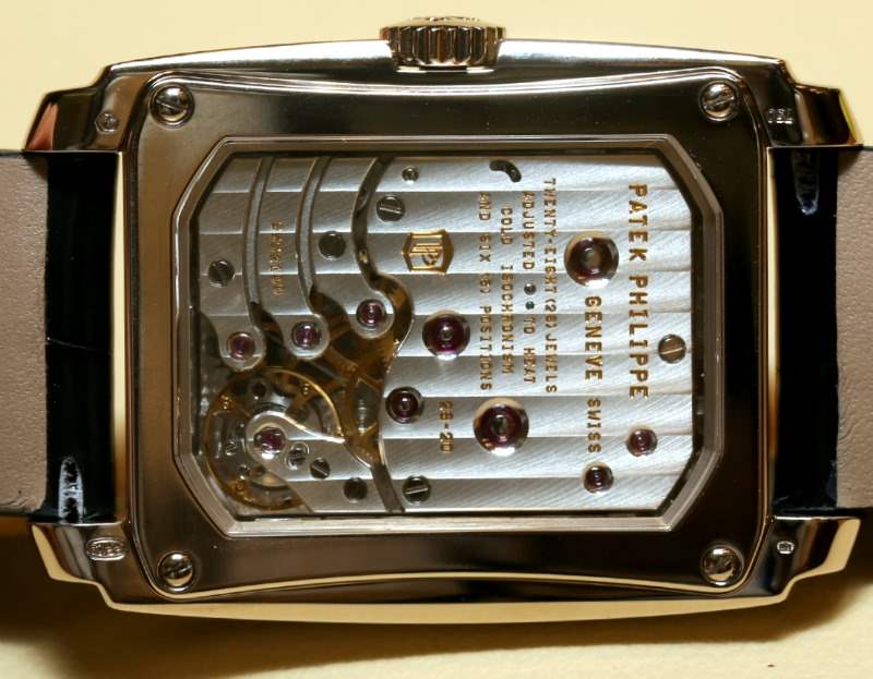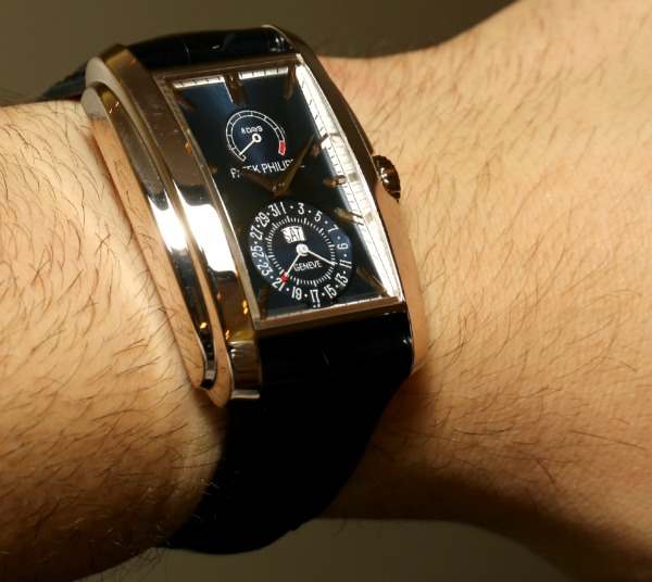 很難抗拒“啞光藍色旭日形”表盤(如百達翡麗的稱呼)的魅力,但加上拋光的太妃糖指針,在光線下的易讀性并不理想。盡管如此,盡管矩形表盤的比例令人尷尬,但就可讀性而言,百達翡麗在指針和應用時標方面做得很好。“銀白色蛋白石”表盤非常棒。非常輕,它與那些啞光黑色混合得非常好。百達翡麗是目前生產這些深黑色但細節豐富的黑色指針和時標的王者。