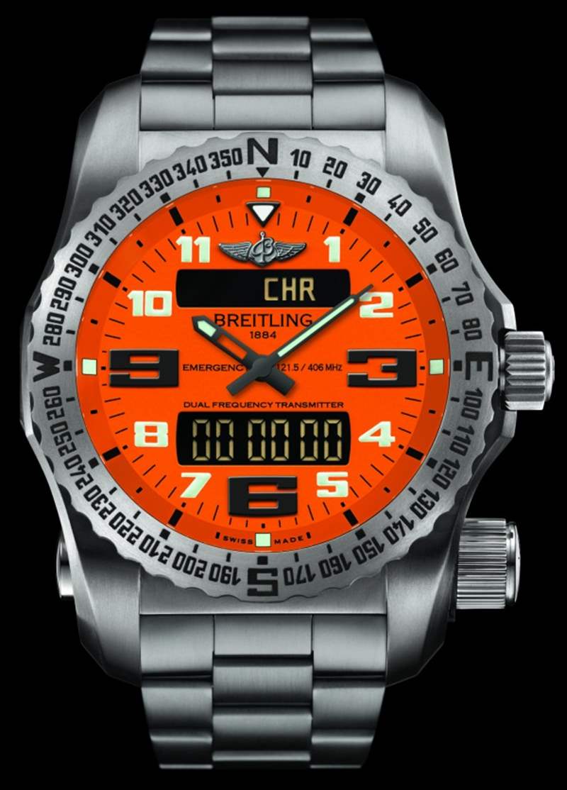 Emergency II 手表防水深度達(dá) 50 米,不適合在水下度過任何嚴(yán)肅的時(shí)光。表盤有黑色、黃色和橙色三種顏色。表盤上方是一塊藍(lán)寶石水晶表鏡,與表殼相連的是鈦金屬專業(yè)手鏈或百年靈 Diver Pro III 橡膠表帶。