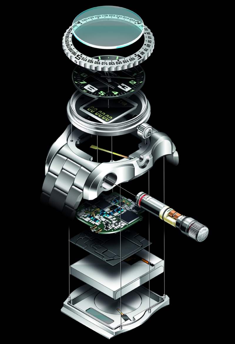 手表內(nèi)部是經(jīng)過瑞士百年靈 Calibre 76 SuperQuartz COSC Chronometer 認(rèn)證的多功能石英機(jī)芯。這些出色的熱補(bǔ)償石英機(jī)芯提供豐富多樣的功能,例如 1/100 秒計(jì)時(shí)碼表、倒數(shù)計(jì)時(shí)器、世界時(shí)間功能、鬧鐘和完整日歷。這是通過時(shí)間模擬指針和兩個(gè)負(fù)顯示 LCD 屏幕完成的。所有功能均通過表冠操作。SuperQuartz 等熱補(bǔ)償石英機(jī)芯每年精確到正負(fù) 10 秒左右(非常好)。