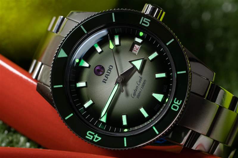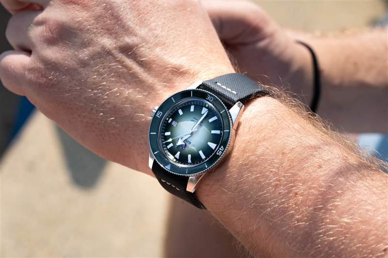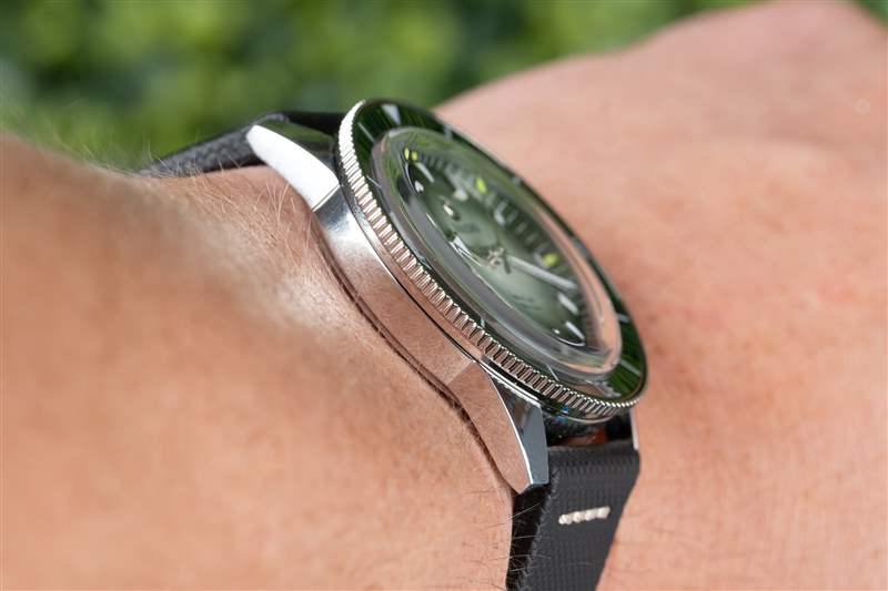 庫克船長系列的標志是其體育場表圈。硬幣邊緣經過完全拋光,綠色陶瓷嵌件也是如此,其上刻有 Super-LumiNova 填充標記。與扁平邊框類似,但外觀更酷,這種風格最大化了握持面積,同時最小化了高度,而更常見的凸形邊框通常會導致更高的高度或更少的握持力。可以肯定的是,卡梅倫諾里庫克船長通過了我嚴格的表圈測試:當我的手和表圈都是濕的時(在我兒子洗澡時和在海里時),我能夠旋轉它。高度的比例優勢也很明顯,腕表厚度為 12.3 毫米,佩戴起來非常舒適,尤其是對于 42 毫米、300 m WR 腕表而言。雖然它不是瑞士 300m 跳水運動員中最瘦的,但它擊敗了歐米茄海馬和勞力士潛航者,前者的表圈在潮濕時毫無用處。