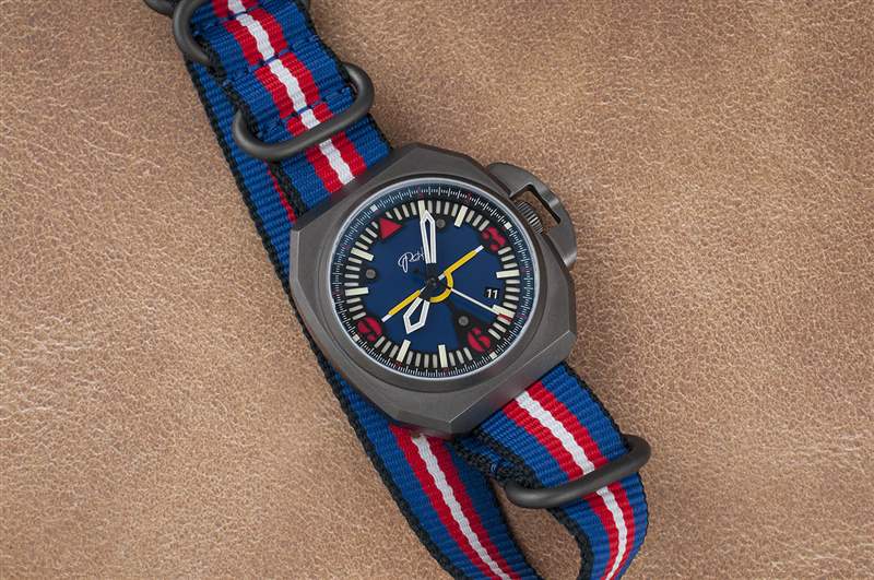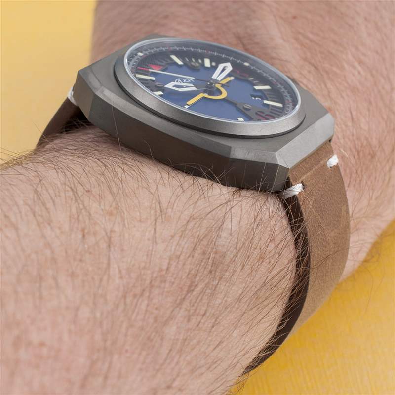 這款手表的名字來源于飛機上的姿態計(不要與高度混淆),指示飛機相對于地平線的方向。雖然靈感顯而易見,但它很微妙,不會打在你臉上,也不會讓人感覺像是在向 Bell & Ross 致敬。帶有藍色 AR 涂層的藍寶石水晶玻璃使表盤清晰可見。廣告留言廣告信息結束