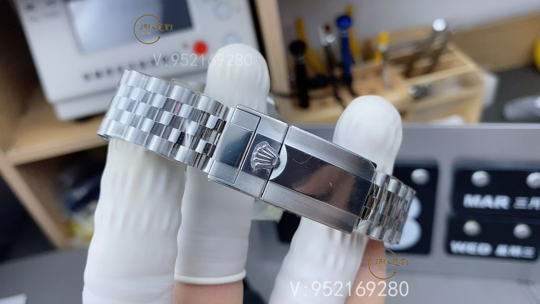直徑是40mm。厚度是12.4,表殼和表鏈采用的是904的精鋼材質(zhì),表殼兩側做了一個拋光的處理,再來看一下把頭的logo做工也沒什么問題,五銖鏈是兩邊拉絲,中間拋光,也有三珠鏈的版本供大家選擇。我來看一下扣子logo也是一體成型的,沒有任何的焊接點,內(nèi)側是做了一個磨砂的處理,編碼是S6U,不過C廠的編碼是經(jīng)常換的,所以是不是C廠貨一定不要去看這種編碼,包括貼紙一定要去看是不是丹東的機芯,包括動能不能滿動能狀態(tài)下能不能達到70小時。