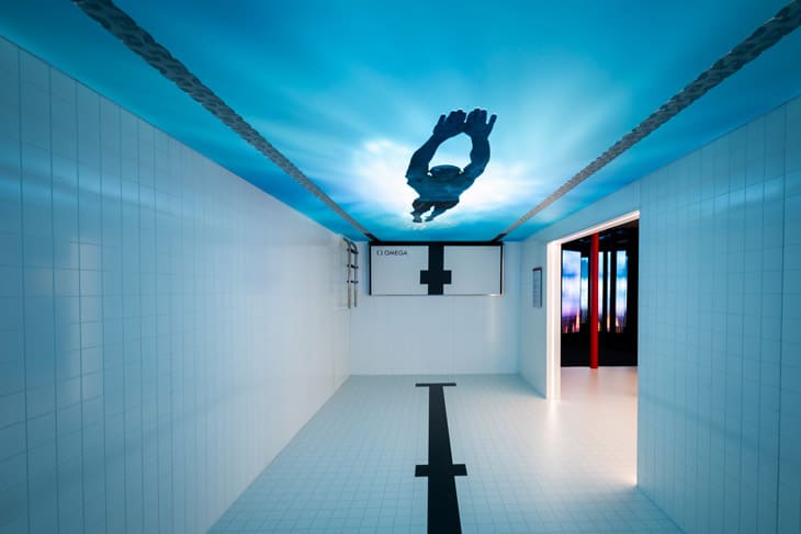 特別設(shè)置的游泳池房間,通過真實的水下效果和精心設(shè)計的影片,展示了歐米茄如何將精準數(shù)據(jù)應(yīng)用于游泳項目,輔助裁判和大會做出公正的判決。