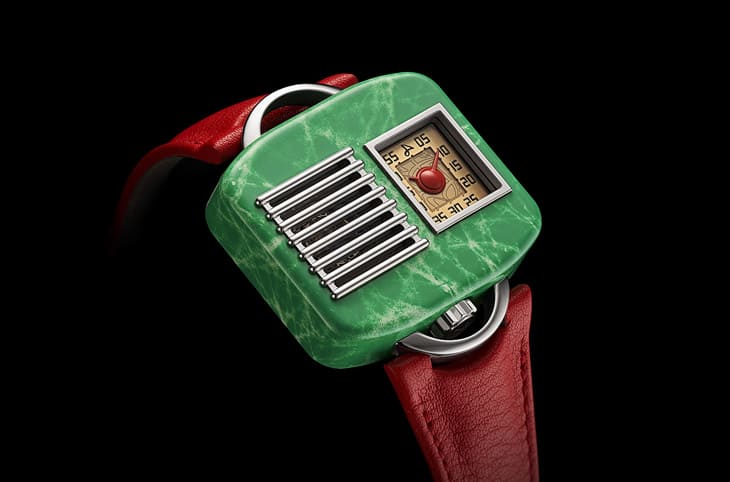 - Retrovision ’47(ED20-SP00):靈感來自1940年代的收音機,綠色不規(guī)則紋理表殼,以及紅色皮革表帶,復(fù)古而搶眼。陀飛輪裝置和偏心小表盤的設(shè)計,讓這款表在視覺上和功能上都獨樹一幟。