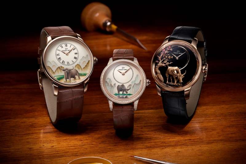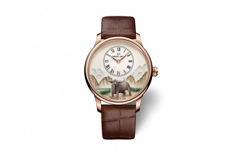 Jaquet Droz亦是生肖表的??停彝ǔ6紩豢跉馔瞥鰩卓畈煌L格。而我個人就最喜歡它微繪的系列。這枚Petite Heure Minute Buffalo先用象牙白的琺瑯表盤上,以微繪工藝畫出霧氣繚繞的群山峻嶺,前面站著一頭英姿煥發、神態祥和的牛。手繪出的這一片柔和寧靜的田園景致別具詩意,極具中國風韻味,全球只限量八枚。