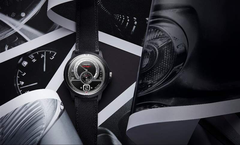 Monsieur的既有表盤配置,這回看起來像是頂尖賽車的儀表板。霧面黑鎳扭索紋表盤上,12點鐘位置可見「Superleggera」代表標志,其字型呼應Gran Turismo 車款極致奢華符碼,小秒盤上的數字60 與跳時指針也以紅色呼應。黑色尼龍表帶縫綴黑色小牛皮飾邊,并搭配紅色小牛皮內襯表帶。