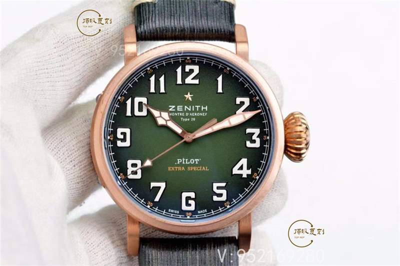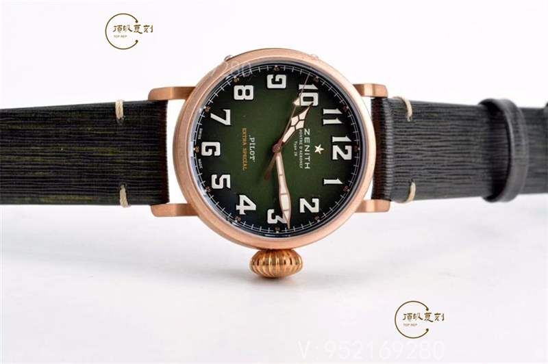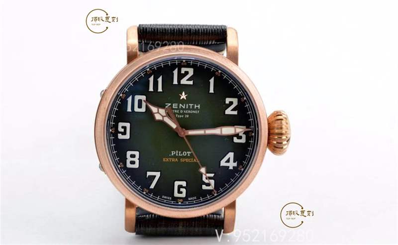 這款真力時(shí)的青銅大飛是一款非常火爆的款式,其青銅材質(zhì)外殼和卡其綠色的表盤交相呼應(yīng),十分養(yǎng)眼撩人。青銅材質(zhì)隨著時(shí)間的流逝,會(huì)形成獨(dú)有的銅綠色,這種時(shí)間的痕跡就是讓人懷舊的感覺(jué)。表盤上的阿拉伯?dāng)?shù)字時(shí)標(biāo)完全由SuperLuminova夜光材料制成。標(biāo)志性的洋蔥頭表冠經(jīng)典可愛(ài)。真品腕表搭載Elite 679型自動(dòng)上鏈機(jī)芯,動(dòng)力儲(chǔ)備至少50小時(shí)。