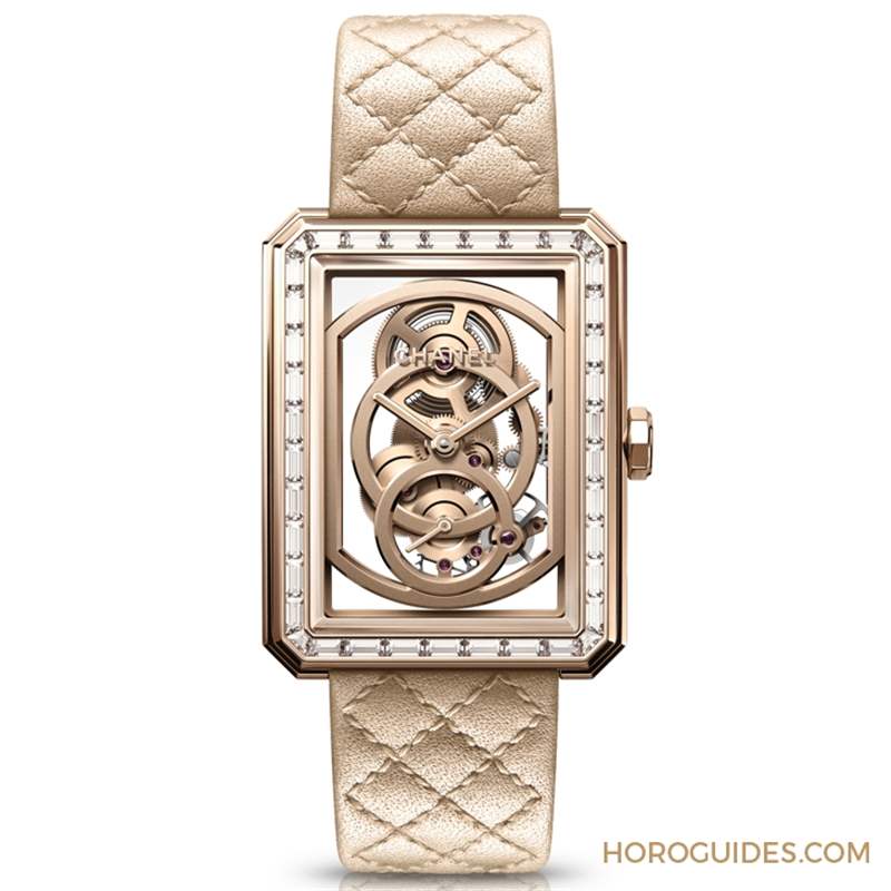 有別于Caliber 3機芯先前既有的黑色面貌,2021年全新發表的Boy·Friend鏤空腕表則改以CHANEL另一個代表色18K Beige米色金帶出煥然一新的面貌,所有機芯零件皆以電鍍處理為金色,與18K Beige米色金表殼、表圈及表款相應成一體,創造出單一色調的優雅風格。