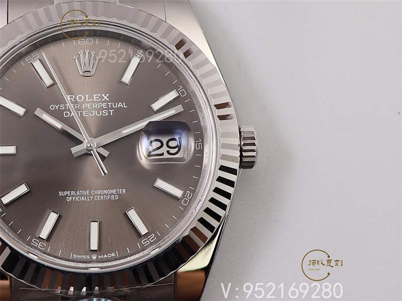 勞力士日志126334,蠔式表殼搭配三角坑紋外圈,表殼及表耳兩側折射出淡雅光澤,令41毫米蠔式表殼的輪廓更突出,倍添魅力。從審美角度來看,不同型號的日志型腕表在經歷了歲月洗禮之后,仍然保留著最初的美學元素。而其傳統的表款,更是易于辨識的著名腕表。目前新款腕表相對于之前的版本,最明顯修改的地方就是六點位置由之前的30改為了勞力士皇冠標志。復刻與正品在表殼材質上是有區別的,正品材質為白色黃金鋼(蠔式鋼與18ct白色黃金的組合),復刻為904L進口鋼制,兩者色澤相差不大,重量上正品略重,不過這一點相對來說比較難以區分。這款腕表整體的表帶以及表殼相對來說比較薄,所以重量并不太重,較輕。