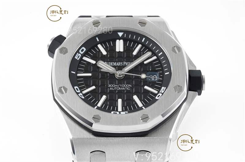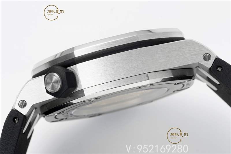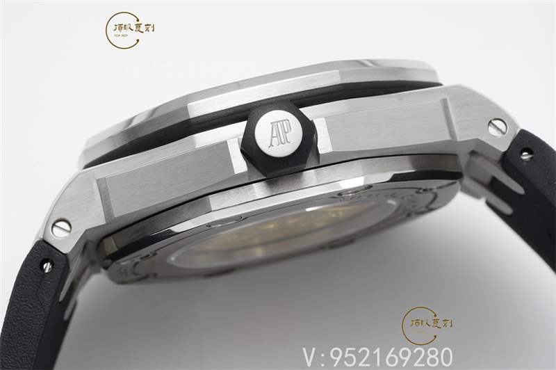 左邊10點(diǎn)位把頭作用是調(diào)節(jié)盤(pán)面外圈的可旋轉(zhuǎn)潛水計(jì)時(shí)圈口,右邊3點(diǎn)位是正常的調(diào)時(shí)表冠,兩個(gè)表把頭都配有黑色的橡膠材質(zhì),手感轉(zhuǎn)動(dòng)起來(lái)柔軟舒適。表殼側(cè)面打磨得十分光滑精致,拉絲處理后,呈現(xiàn)出靚麗的色澤。在突顯運(yùn)動(dòng)質(zhì)感的同時(shí),可以減少意外劃痕對(duì)腕表品相的影響。中間表冠受到兩側(cè)護(hù)肩的保護(hù),表冠上鐫刻AP品牌logo,并且采用六角形造型設(shè)計(jì),方便操作調(diào)校時(shí)間。
