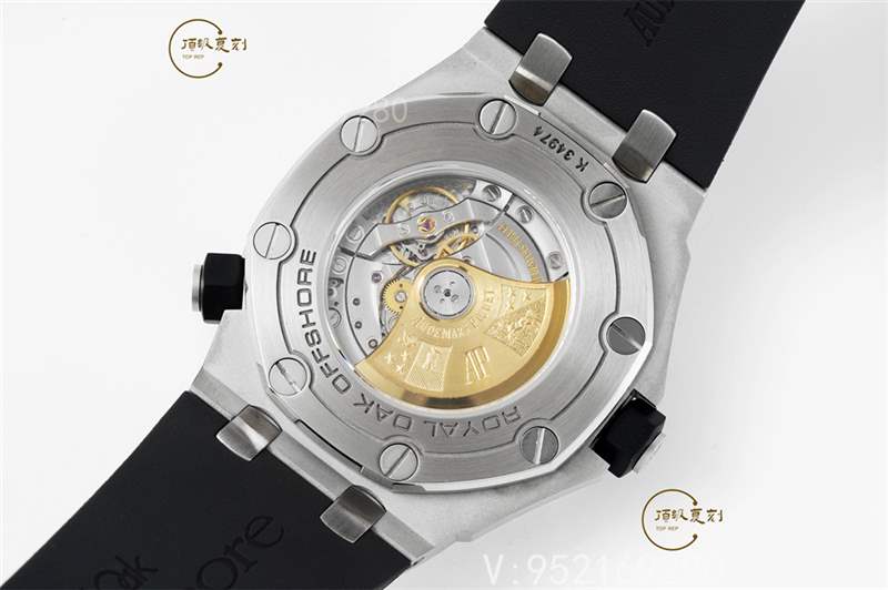 背面是透底的設(shè)計(jì),通過(guò)藍(lán)寶石玻璃鏡面可以盡情觀賞精美絕倫的機(jī)芯運(yùn)作。ZF愛(ài)彼15710搭載獨(dú)家定制AP.CAL.3120機(jī)芯,功能穩(wěn)定,夾板的打磨很干凈,特調(diào)色18K玫瑰金自動(dòng)托顏色,沒(méi)有坑坑洼洼的感覺(jué)。底蓋四周也會(huì)有貴金屬刻字,品味細(xì)節(jié),才能體現(xiàn)精髓。