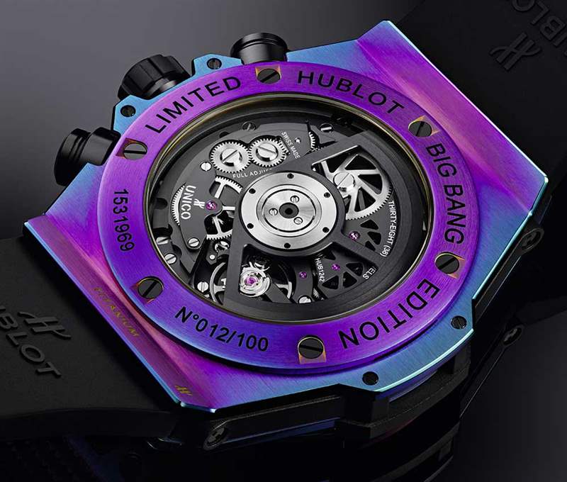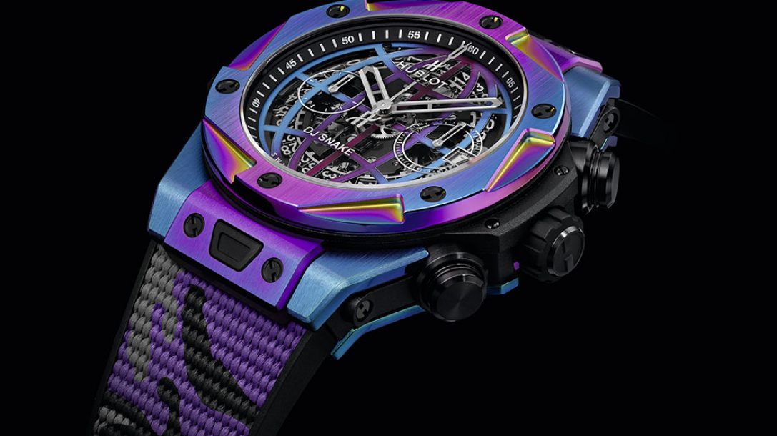 宇舶表和DJ Snake自2018年1月1日起成為合作伙伴,當(dāng)時(shí)他在俄羅斯FIFA世界杯期間主持宇舶表閉幕晚會(huì)的甲板。三年后,這一合作伙伴關(guān)系的第一款手表亮相:The Big Bang DJ Snake。大爆炸的標(biāo)志性設(shè)計(jì)現(xiàn)在具有彩虹般的光澤,具有無數(shù)的藍(lán)色和紫色色調(diào)。45毫米表殼的表圈和六顆鈦金屬組件均采用特殊技術(shù)制造工藝處理,類似于黑色PVD處理。在此過程中,當(dāng)腕表的不同組件涂有不同顏色時(shí),必須分別放置在特定位置。結(jié)果是一種光學(xué)效果,其中手表的顏色根據(jù)光線和從不同角度觀看時(shí)而變化。不僅如此,在虹彩處理之前,零件的表面也硬化了,以提高其附著力。這是一項(xiàng)復(fù)雜的操作,因?yàn)樵谏a(chǎn)的100枚腕表中,很難獲得相同的顏色漸變。表圈外緣的切口由DJ Snake親自設(shè)計(jì)。這些缺口使Big Bang DJ Snake立即被識(shí)別出來,將其與其他系列區(qū)分開來。“融合藝術(shù)”哲學(xué)的例證,宇舶表如此珍視!
