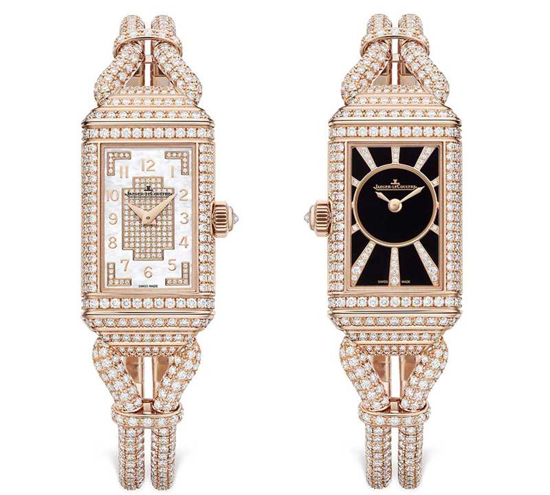 這款時計保留了用于將手表連接到手腕的原始黑色繩索設計,同時增加了一絲高級珠寶,因為柔性表鏈現在由玫瑰金制成并襯有鉆石,表耳和表殼也是如此。腕表尺寸為36.3×18毫米,表冠飾有寶石,搭載積家844型機芯。其手動上鏈機械機芯能夠將時針和分針雙向旋轉,提供38小時的動力儲存。